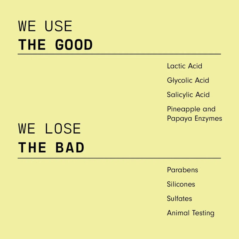Glycolic acid and lactic acid help brighten skin and fade blemish spots while salicylic acid minimizes the appearance of pores and redness.This instant glow is all thanks to vitamin C rich pineapple and papaya enzymes, which gently remove the outer layer of dead skin cells that trap bacteria, while moisturizing and softening skin. The best part? Watching the results build week after week.