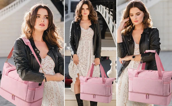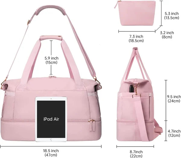 Dry Wet Separate Duffel BagΒ This duffle bag for women delivers roomy main compartment to store your clothes and items. A zippered waterproof PVC lined pocket for wet clothes or towels and swimsuits. In addition, this travel duffel bag also gives an extra small makeup bag for easy storage.