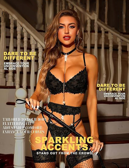 1 bra, 1 thong, 1 choker with chain garter. Unleash your imagination and explore endless possibilities.